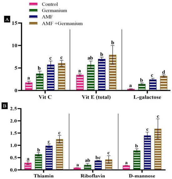 When examining vitamin content, Ge treatment alone, AMF treatment alone, and the combination of both treatments significantly increased the levels of all vitamins (Figure 5). AMF-treated plants showed the highest increases in vitamin C, vitamin E, thiamine, riboflavin, D-mannose, and L-galactose (p < 0.05) by about 227%, 102.8%, 237.9%, 322.2%, 677.7%, and 617.6%, respectively compared to the control (Figure 5A,B). While Ge treatment increased in the examined vitamins, it generally showed lower increases than those observed with AMF, except for vitamin E. The combined treatments resulted in the highest increases in all the studied vitamins.