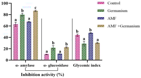 Notable increases in antidiabetic activities were observed in AMF-treated plants, as indicated by the increases in α-amylase inhibition activity (7.05%), α-glucosidase inhibition activity (8.6%), and glycemic index (8.7%) (p < 0.05). Ge treatment resulted in a substantial rise in α-amylase inhibition activity (26.4%) and α-glucosidase inhibition activity (111.3%), while the glycemic index decreased by around 34.5% (Figure 6).
