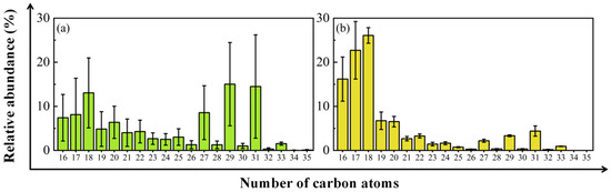 Leaf waxes are important plant-derived compounds that coat the leaf surface and play a vital role in reducing water evaporation, protecting against ultraviolet radiation, and preventing microbial infections [1,2,3,4,5]. Long-chain n-alkanes (n-C27–n-C35) are the main components of plant leaf waxes, with odd-numbered carbon chain length n-alkanes generally being more abundant than even-numbered ones [1,6,7]. In addition to leaves, many other plant organs can synthesize long-chain n-alkanes with an odd-over-even carbon number preference, but their concentrations are much lower than those found in leaf waxes [8,9,10].