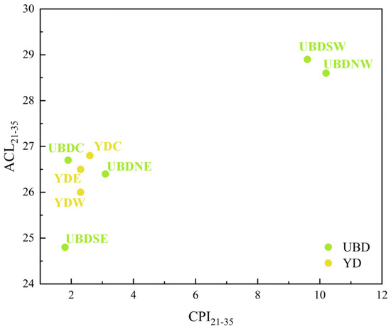The range, average, and standard deviation of ACL21–35 and CPI21–35 of aeolian sand from the Northern UBD is 24.8–28.9, 27.1 ± 1.7, and 1.8–10.2, 5.3 ± 4.2, respectively, while those are 26.0–26.8, 26.4 ± 0.4, and 2.3–2.6, 2.4 ± 0.2 for the Eastern YD (Figure 2). The western regions of the Northern UBD (UBDNW and UBDSW) exhibit the highest ACL21–35 and CPI21–35 among all the aeolian sand samples, while the central and eastern regions of the Northern UBD (UBDC, UBDNE, and UBDSE) bear resemblance to the Eastern YD (YDW, YDC, and YDE), sharing comparatively lower ACL21–35 and CPI21–35, and UBDSE exhibits the lowest ACL21–35 and CPI21–35 among all the aeolian sand samples (Figure 2).
