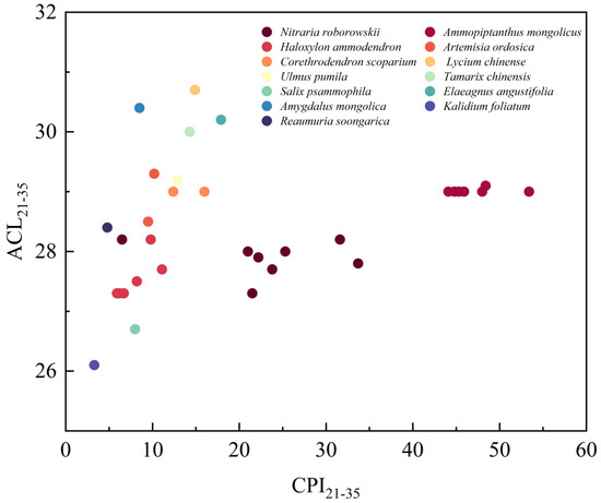 Scatter plot of ACL21–35 versus CPI21–35 of plant leaf n-alkanes from the Northern UBD.