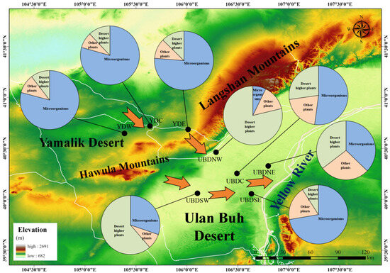 Schematic diagram of the spatial variability of biogenic sources (microorganisms, desert plants, and other plants) for sedimentary n-alkanes of Eastern YD and Northern UBD. Yellow arrows signify the trends of sand transport [58].