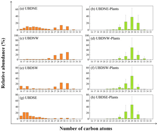 Distribution patterns variations of n-alkanes between aeolian sand and the surrounding (<20 km) desert plants in the Northern UBD. (a) UBDNE, (b) average of plants surrounding UBDNE, (c) UBDNW, (d) average of plants surrounding UBDNW, (e) UBDSW, (f) average of plants surrounding UBDSW, (g) UBDSE, and (h) average of plants surrounding UBDSE.