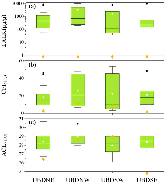Box plots of leaf wax n-alkanes (a) ΣALK, (b) CPI21–35, and (c) ACL21–35 of desert plants surrounding the four aeolian sand samples in Northern UBD. Each green box portrays the central 50% of the group values, with the central line indicating the group median. The white point denotes the mean of each group, while the black points identify outliers. The yellow diamonds denote the values of the four aeolian sand samples, and the diamonds beneath the horizontal axis indicate the values are lower than the vertical axis’s minimum. ΣALK is represented using logarithmic coordinates.