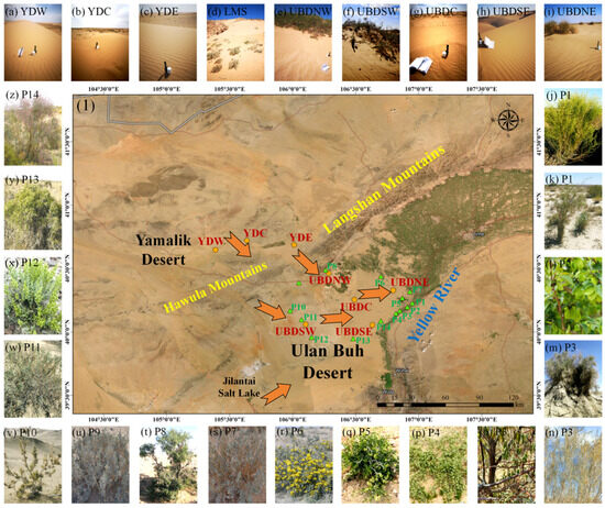 (1) Topographic map depicting the distribution of sampling sites across the study area. Sampling locations for aeolian sands are indicated by yellow dots: YDW (western region of Eastern YD); YDC (central region of Eastern YD); YDE (eastern region of Eastern YD); UBDNW (northwestern region of Northern UBD); UBDSW (southwestern region of Northern UBD); UBDC (central region of Northern UBD); UBDSE (Southeastern region of Northern UBD); UBDNE (northeastern region of Northern UBD). Sampling locations for desert plants are indicated by green triangles: P1–P14. Yellow arrows signify the trends of sand transport [58]. Landscapes of the sampling site: (a) shifting dunes of YDW; (b) shifting dunes of YDC; (c) shifting dunes of YDE; (d) a sand cascade at the south slope of the LM; (e) shifting dunes of UBDNW; (f) shifting dunes of UBDSW; (g) shifting dunes of UBDC; (h) shifting dunes of UBDSE; (i) shifting dunes of UBDNE. Plant photographs of the sampling site: (j) A. ordosica of P1; (k) L. chinense of P1; (l) U. pumila of P2; (m) T. chinensis of P3; (n) S. psammophila of P3; (o) E. angustifolia of P3; (p) N. roborowskii of P4; (q) N. roborowskii of P5; (r) A. mongolicus of P6; (s) A. mongolicus of P7; (t) A. mongolica of P8; (u) A. mongolicus of P9; (v) H. ammodendron of P10; (w) R. soongarica of P11; (x) K. foliatum of P12; (y) N. roborowskii of P13; (z) C. scoparium of P14.