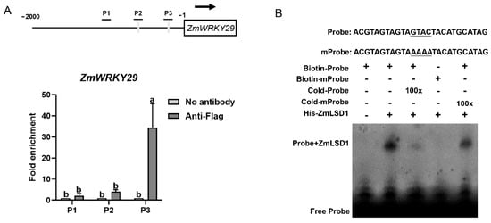 2.5. ZmLSD1 Directly Binds to ZmWRKY29 Promoter In Vitro and In Vivo