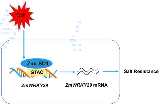 Li, Q.; Hu, R.; Jiang, M.; Zhang, W.; Gao, X.; Zhang, B.; Liu, W.; Wu, Z.; Zou, H. ZmLSD1 Enhances Salt Tolerance by Regulating the Expression of ZmWRKY29 in Maize. Plants 2024, 13, 2904. https://doi.org/10.3390/plants13202904