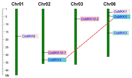 All OsMKKs are unevenly distributed on the rice chromosomes. Among them, three OsMKKs are located on chromosome 6. Chromosomes 1 and 3 each contain one OsMKK, while chromosome 2 contains two OsMKKs (Figure 1); no OsMKK gene is found on any of the other eight chromosomes. Gene duplication only has two types: segmental duplication and dispersed duplication. Except for OsMKK4 and OsMKK5, which were derived from segmental duplication, the other mapped OsMKK genes all resulted from dispersed duplication (Figure 1).
