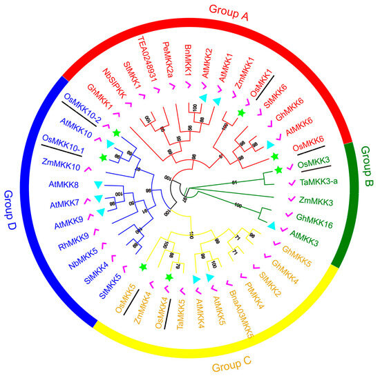 A phylogenetic tree was constructed using 33 known functional MKK proteins from Arabidopsis, rape (Brassica napus), cotton (Gossypium hirsutum), tobacco (Nicotiana benthamiana), poplar (Populus deltoides × P. euramericana cv. ‘Nanlin895’), black cottonwood (Populus trichocarpa), tomato (Solanum lycopersicum), rose (Rosa hybrida), potato (Solanum tuberosum), wheat (Triticum aestivum), tea plant (Camellia sinensis), and maize (Zea mays), and all OsMKK proteins from rice (Table S3) to enhance the understanding of molecular evolution and phylogenetic relationship of plant MKK proteins. The OsMKK proteins could be classified into four subgroups (Groups A–D) based on the analysis of sequence homology and phylogeny, and Group B showed unique functions related to development and drought stress (Figure 2 and Table S3). It is suggested that the functions of rice MKK proteins may primarily involve abiotic stress, immunity, and development, similar to those observed in other species.
