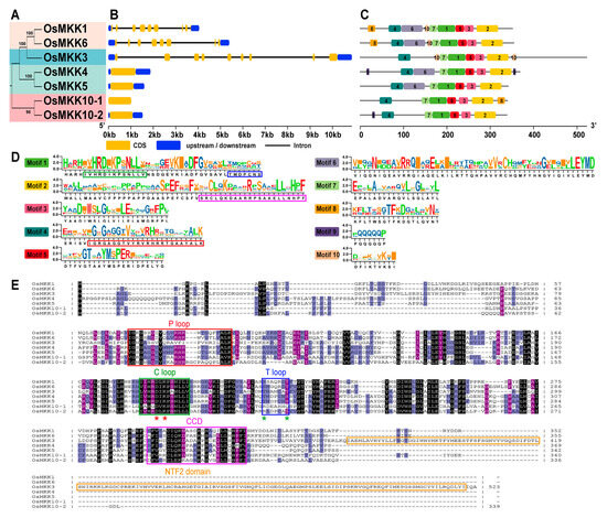 Gene structure and conserved protein motifs analysis of OsMKK genes. (A) ML phylogenetic tree analysis of OsMKKs. (B) Exon–intron structure of OsMKKs, where golden yellow boxes represent coding sequences (CDS), the blue boxes represent upstream/downstream sequences, and the black lines represent the introns. (C) The conserved motifs in OsMKK proteins. The ten conversed motifs are displayed in various unique colors. The gene and protein length are indicated by the scale at bottom. (D) Sequence logos of ten conserved domains. The conserved sequences of the different motifs are highlighted in different colored rectangles. (E) Sequence alignment and motif analysis of OsMKKs. Identical amino acids are shaded black, and similar amino acids are shaded purple. The P, C, and T loops, CCD, and the NTF2 domain are highlighted in colored rectangles (P loop: red; C loop: green; T loop: blue; CDD: pink; NTF2: yellow). The red stars show the active site, and the green stars indicate the phosphorylation site of OsMKK proteins. Species information can be found in Figure S1.
