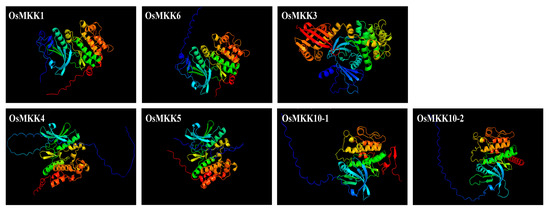Predicted 3D models of OsMKK proteins. Models have been generated by Alpha 2 and visualized by rainbow color from N (blue) to C terminus (red) using PyMOL v2.5.8 software.