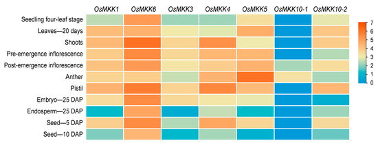 In order to analyze the expression of OsMKKs during rice growth and development, we downloaded the published transcriptome data from the website (http://rice.uga.edu/expression.shtml, accessed on 15 April 2023) and used TBtools-II to create heat maps [66]. The rice tissue-specific expression data consisted of 11 stages, as follows: shoots, anther, pistil, leaves—20 days, embryo—25 DAP (Days After Pollination), endosperm—25 DAP, seed—5 DAP, seed—10 DAP, pre-emergence inflorescence, post-emergence inflorescence, and seedling four-leaf stage (Table S5).