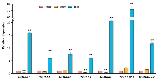 Expression patterns of 7 OsMKK genes in the roots, stems, and leaves of rice seedlings. Data are represented as the mean ± SD of three independent replicates. Asterisks indicate statistically significant differences compared with root (** p < 0.01; Student’s t-test).