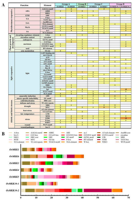 Cis-acting elements in the promoter of OsMKK genes. (A) Numbers of predicted cis-acting elements in OsMKK promoters are shown. (B) The distribution of predicted cis-acting elements on different gene promoters. Different colors represent different cis-acting elements.