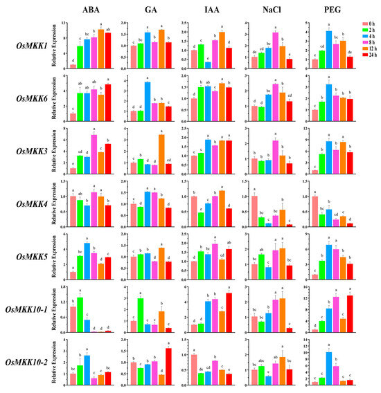 Expression levels of OsMKK genes under ABA, GA, IAA, salt, and drought stress treatments. Data are represented as the mean ± SD of three independent replicates. Different letters above bars indicate significant differences (p < 0.05; Tukey’s test).