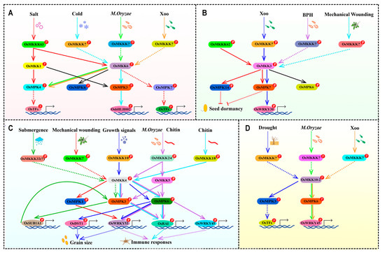 Through multiple sequence alignment and phylogenetic analysis, OsMKKs are classified into four groups based on the evolution of the S/T-X5-S/T conserved motifs and functions (Groups A–D) (Figure 2). OsMKK1 and OsMKK6 belong to group A along with MKK from other plants with known functions, such as ZmMKK1 [31], AtMKK6 [32,33], GhMKK6 [18], and StMKK6 [34]. ZmMKK1 is associated with drought and salt tolerance in transgenic Arabidopsis [31]. The OsMKKK63-OsMKK1-OsMPK4 cascade confers tolerance to salt stress [35,36] (Figure 9A). OsMKK1 plays roles in triggering downstream stress-responsive pathways and may be involved in drought stress because OsMKK1 and ZmMKK1 are on the same branch (Figure 2). AtMKK6 regulates cytokinesis through the downstream target protein AtMPK4 [32,33]. The GhMKK6–GhMPK4 cascade functions downstream of the scaffold protein GhMORG1 and confers resistance to cotton against Fusarium oxysporum [18]. StMKK6 plays an important role in potato immunity, while the OsMKKK63–OsMKK6 and OsMKK6–OsMPK3 cascades are involved in seed dormancy and cold tolerance, respectively [34,35,37,38]. Thus, OsMKK6 may play roles in innate immunity and disease resistance. As shown in Figure 9B, OsMKK3 is related to Xoo, BPH, seed dormancy, and mechanical wounding and may also be related to drought and salt stress according to evolutionary clues (Figure 2) [39,40,41,42,43,44]. The OsMKK4 and OsMKK5 in Group C have been extensively studied, and their functions are relatively clear, while in Group D, only OsMKK10-2 has been studied (Figure 9C,D) [3,45,46,47,48,49,50,51,52,53,54]. OsMKK10-1 may have functions in drought tolerance and defense responses, or OsMKK10-1 may have a weakened function because of gene inactivation due to its low expression (Figure 5). Therefore, further research is needed to investigate its function.