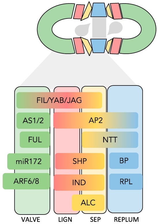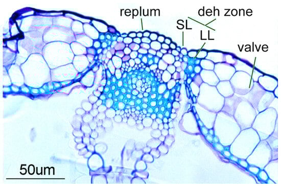 Fruit is a key evolutionary innovation of flowering plants, responsible for the protection and dispersal of developing seeds. Fruits can be divided in two categories: dry and fleshy. While the latter have evolved to be attractive to animals that eat them and thus act as vectors for seed dissemination, dry fruits usually rely on wind or other mechanical forces to disperse seeds. Many dry fruits open at maturity to release seeds directly into the environment. For this, they must undergo the so-called dehiscence or pod shatter process, which usually involves the development of specialized tissues that ultimately allow the controlled opening of the fruit at the optimal stage of seed maturation []. The mode of fruit aperture is an important ecological and agronomic trait for crop improvement, and hence, over the last two decades, many research efforts have focused on understanding the molecular basis of the dehiscence process mainly in the model plant Arabidopsis thaliana. In the ovary of Arabidopsis pods, three different zones can be distinguished: the valves, the replum, and the valve margins (Figure 1). The pod walls (the valves) ensure the protection and development of the seeds until their optimum maturity, at which point they detach, promoting seed dispersal. The two valves are separated by the replum, a narrow domain external to the main vascular bundles, corresponding to the outer part of the septum that divides the ovary longitudinally. The valve margin tissues are placed at the valve/replum junction to allow for the detachment of both valves from the replum at pod maturity. The valve margin comprises two specialized cell types. On the one hand, the separation layer (SL) is formed by small cells adjacent to the replum side, where it facilitates valve detachment through cell–cell separation processes [,]. On the other hand, a cell stripe of lignified cells (the lignification layer, LL) comes up on the valve side of the margin to likely provide, together with the SL, the required spring-like forces that mechanically trigger valve detachment [].