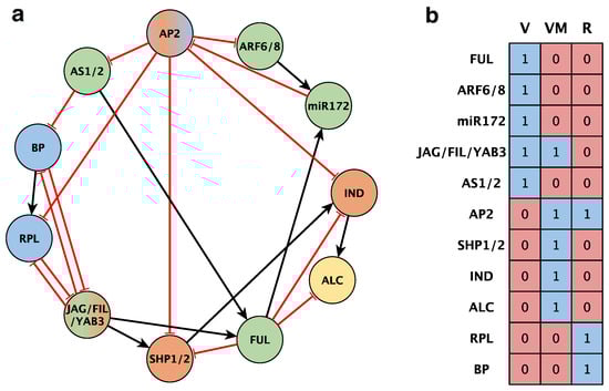 (a) A GRN proposed for the A. thaliana fruit dehiscence mechanism based on the literature. The network topology depicts the nodes considered in the model as well as the experimentally supported genetic interactions among them. Black edges with arrowheads are activating regulations and red edges with flat ends represent repressive regulations. Each node color represents a functionally different tissue. A dual color fill is for those active in more than one tissue. Green: valve (V); orange: valve margin (VM); yellow: separation layer (SL); blue: replum (R). (b) Attractors obtained with the network configuration in (a). Each column is the attractor that corresponds to a cell type, valve (V), valve margin (VM), or replum (R). Each network gene is represented by a table row. Red or 0 stands for a transcriptionally repressed gene or an absent protein; blue or 1 is for a transcriptionally active gene or a present protein.