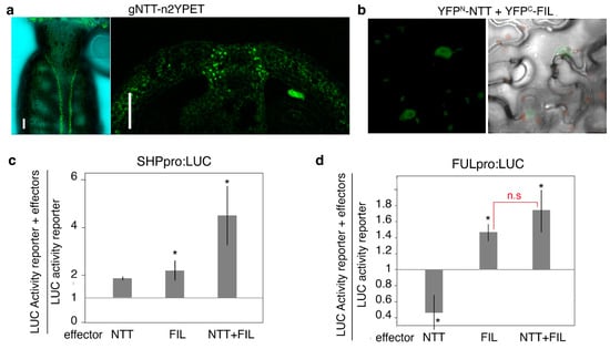 (a) The localization of NTT-n2YPET in anthesis ovaries. The signal is clearly detected along a narrow stripe in the valve margin (left), that in a transversal section appears to be confined to the separation layer. (b) A BiFC assay showing fluorescence complementation mediated by the interaction of NTT and FIL. Controls for the BiFC experiment are shown in Supplementary File S4. (c,d) Transient assays of SHPpro:LUC (c) and FULpro:LUC (d) expression. SHP:LUC-35S::REN and FUL:LUC-35S::REN reporter constructs were transiently expressed in Nicotiana benthamiana leaves either alone or together with effectors 35S:NTT, 35S:FIL, or both. The expression of REN was used as an internal control. LUC activity was normalized with REN in each case and the relative activity of the reporter + effectors to the reporter alone was calculated (n = 6). Asterisks indicate significant differences according to a Student’s t-test (p < 0.05) from the values obtained when the promoter::LUC-35S::REN reporters were infiltrated alone, while n.s. means no significant differences between the indicated data.