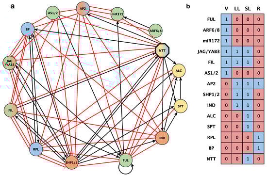 (a) A GRN proposed for the A. thaliana DZ including NTT and the set of novel interactions. Black edges with arrowheads are activating regulations and red edges with flat ends represent repressive regulations. Each node color represents a functionally different tissue. An octagonal bold line shape is for a novel NTT node. Dual color fill is for those active in more than one tissue. Green: valve (V); orange: valve margin (VM); yellow: separation layer (SL); blue: replum (R). (b) Recovered attractors corresponding to those expected for a dehiscent Arabidopsis fruit. Each column is the attractor that corresponds to a cell type, valve (V), lignification layer (LL), separation layer (SL), or replum (R). Each network gene is represented by a table row. Red or 0 stands for a transcriptionally repressed gene or absent protein; blue or 1 is for a transcriptionally active gene or a present protein.