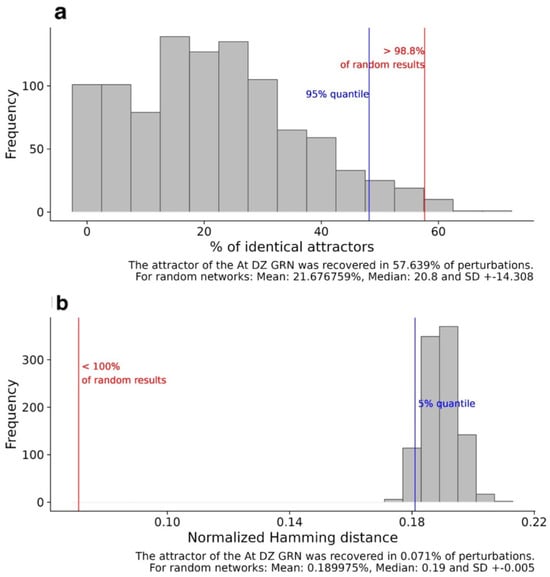 Attractor robustness analysis. The attractors recovered after perturbing either the Boolean functions (a) or transition states (b) of the DZ GRN and similar random networks. The red line represents the result corresponding to the DZ network model. The blue line determines the significance level calculated from inducing the same type of perturbations to similar random networks. In panel (a), the bars represent the frequency with which random networks recovered a certain percentage of their original attractors. Panel (b) illustrates the normalized Hamming distance between the successor states of the original and the perturbed network obtained after perturbing the state transitions in random networks and the dynamic GRN dehiscence model.