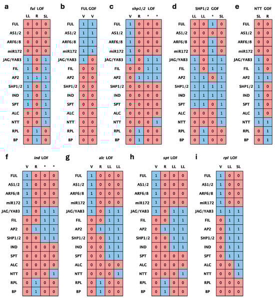 Attractors recovered by loss- or gain-of-function mutant simulations of selected Arabidopsis DZ regulators. Each column is an attractor configuration: valve (V), lignification layer (LL), separation layer (SL), or replum (R). The rows represent the state of each node: the squares in blue indicate nodes that are in an “ON” state and those in red are in an “OFF” state. Columns labeled with an asterisk indicate attractors with differences from the four canonical configurations. (a) Simulation of FUL loss-of-function (ful mutant). (b) Simulation of FUL gain-of-function. (c) Simulation of SHP1 and SHP2 loss-of-function (shp1 shp2 double mutant). (d) Simulation of SHP1 and SHP2 gain-of-function. (e) Simulation of NTT gain-of-function. (f) Simulation of IND loss-of-function (ind mutant). (g) Simulation of ALC loss-of-function (alc mutant). (h) Simulation of SPT loss-of-function (spt mutant). (i) Simulation of RPL loss-of-function (rpl mutant).