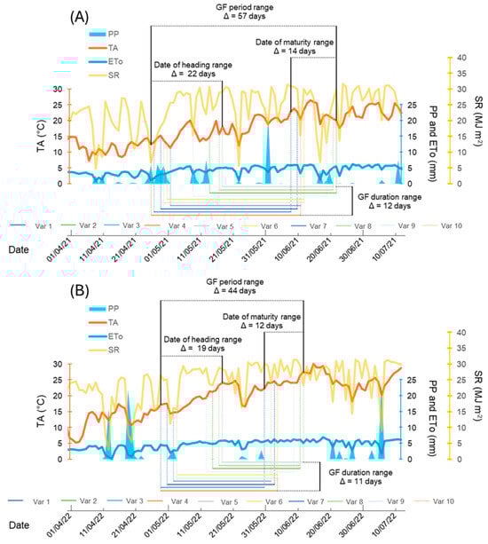 Average temperature (TA, °C), precipitation (PP, mm), potential evapotranspiration (ETo, mm), and global solar radiation (SR, MJ m−2) during grain filling in each wheat variety (var. 1 to 10) in (A) 2020–2021 Almacelles Lleida NE Spain, and (B) 2021–2022 Sucs Lleida NE Spain crop cycles. Phenology dates, such as date of heading, date of maturity, and grain filling duration (GF) ranges, are visually represented. The time span on the x axes of both panels is indicated by a line with major tick marks every month and by minor tick marks every 10 days.