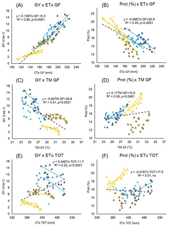 Simple linear regression between weather parameters experienced by each wheat variety during grain filling, considered as the time between heading and maturity (cumulative potential evapotranspiration, ETo, maximum temperature exposure, TM, and total potential evapotranspiration, ETo TOT), grain yield (GY, panels (A,C,E)), and protein concentration (Prot %, panels (B,D,F)). Linear regressions for each year and experimental condition are displayed with a solid line if they are statistically significant.