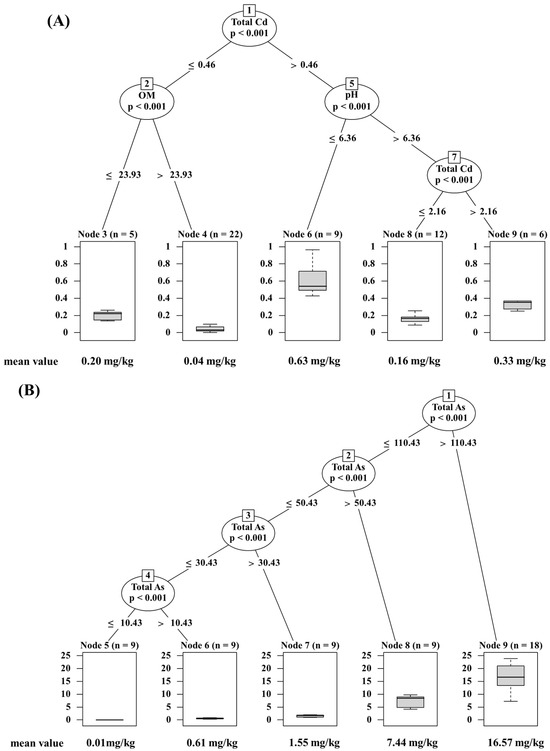 Conditional inference trees (CITs) were employed to ascertain the key factors and conditions influencing the accumulation of Cd, As, and Pb in water spinach (Figure 7). All the significant mappings were included in the resulting trees (p < 0.01). For Cd, the CITs results were categorized into five groups, with the soil total Cd, OM, and pH serving as classification factors (Figure 7A). The soil total Cd emerged as the primary splitting factor for the root nodes in the regression tree, indicating its significance in contributing to the accumulation in water spinach. The critical values for the soil total Cd were determined to be 0.46 and 2.16 mg/kg, with the soil OM at 23.93 g/kg and soil pH at 6.36, as revealed by significance testing of the CITs models. The accumulation of Cd in water spinach was notably affected by variations in the soil properties resulting from organic fertilizer application. For instance, when the soil total Cd was ≤0.46 mg/kg, the Cd content in water spinach at a soil OM ≤ 23.93 g/kg was 5.0 times higher compared to that at a soil OM > 23.93 g/kg. Similarly, when the soil total Cd was >0.46 mg/kg, the Cd content in water spinach was 3.9 times higher when the soil pH was ≤6.36 compared to when the soil pH was >6.36, and the soil total Cd was ≤2.16 mg/kg. Conversely, no significant effect of the soil properties on As and Pb accumulation in water spinach was observed, with only the soil total As and Pb identified as the primary factor (Figure 7B,C).