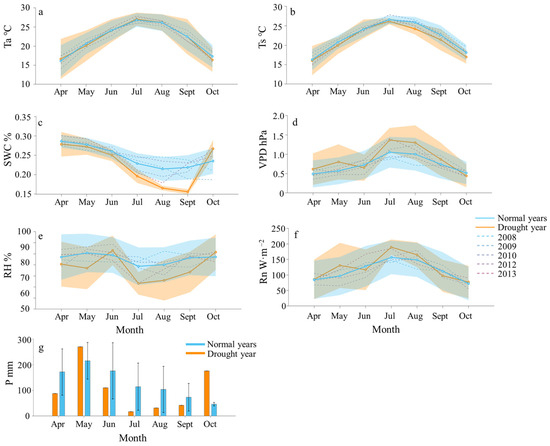 Dynamics of environmental factors during the growing season in a drought year in the drought year (2011, orange) compared to the normal years (average of 2008, 2009, 2010, 2012, 2013; blue): (a) air temperature (Ta), (b) soil temperature (Ts), (c) soil moisture content (SWC), (d) saturated vapor pressure deficit (VPD), (e) relative humidity (RH), (f) net radiation (Rn), and (g) precipitation (P). The solid lines with dots represent the monthly average daily values, and the shaded regions indicate the standard deviation for the drought year (orange) and normal years (blue). Dashed lines represent the monthly average daily values for different years within the normal year range. Bars represent the cumulative monthly precipitation, with error bars indicating one standard error.