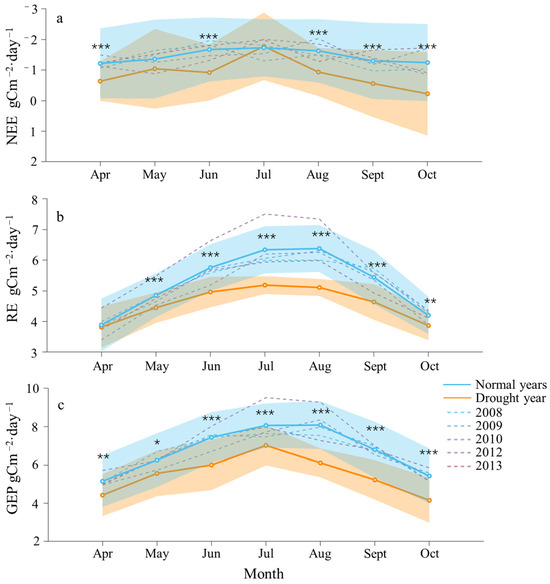 Dynamics of carbon flux components during the growing season in the drought year (2011, orange) compared to normal years (average of 2008, 2009, 2010, 2012, and 2013; blue): (a) net ecosystem exchange (NEE), (b) ecosystem respiration (RE) and (c) gross ecosystem productivity (GEP). The solid lines with dots represent the monthly average daily values, while the translucent fill indicates the standard deviation for the drought year (orange) and normal years (blue). The dashed line represents the monthly average daily values for individual normal years. Asterisks denote the significance of differences between the datasets, with * indicating p < 0.05, ** indicating p < 0.01, and *** indicating p < 0.001.