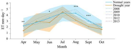 Dynamics of evapotranspiration (ET) during the growing season in the drought year (2011, orange) compared to normal years (average of 2008, 2009, 2010, 2012, and 2013; blue). The solid lines with dots represent the monthly average daily values, and the translucent fill indicates the standard deviation for the drought year (orange) and normal years (blue). The dashed line represents the monthly average daily values for individual normal years. Asterisks denote the significant levels of differences between the two datasets, with * indicating p < 0.05, ** indicating p < 0.01, and *** indicating p < 0.001.