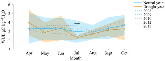 Dynamics of water use efficiency (WUE) during the growing season in the drought year (2011, orange) compared to normal years (average of 2008, 2009, 2010, 2012, and 2013; blue). The solid lines with dots represent the monthly average daily values, and the translucent fill indicates the standard deviation for the drought year (orange) and normal years (blue). The dashed line represents the monthly average daily values for individual normal years. Asterisks denote the significant levels of differences between the two datasets, with *** indicating p < 0.001.