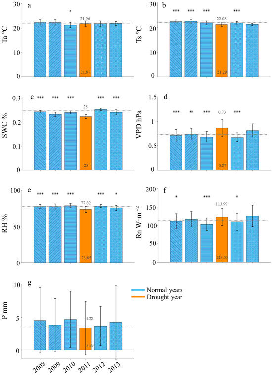 Comparison of daily average values of environmental factors during the growing seasons between the drought year (2011) and the normal years (2008, 2009, 2010, 2012, 2013; blue): (a) air temperature (Ta), (b) soil temperature (Ts), (c) soil moisture content (SWC), (d) saturated vapor pressure deficit (VPD), (e) relative humidity (RH), (f) net radiation (Rn), and (g) precipitation (P). The black short lines are error bars. The dashed line across all bars represents the average of normal years. Numbers above the dashed line correspond to the average of normal years, while numbers below represent values from the drought year. Asterisks denote the significance of differences between the drought year and the various normal years, with * indicating p < 0.05, ** indicating p < 0.01, and *** indicating p < 0.001.