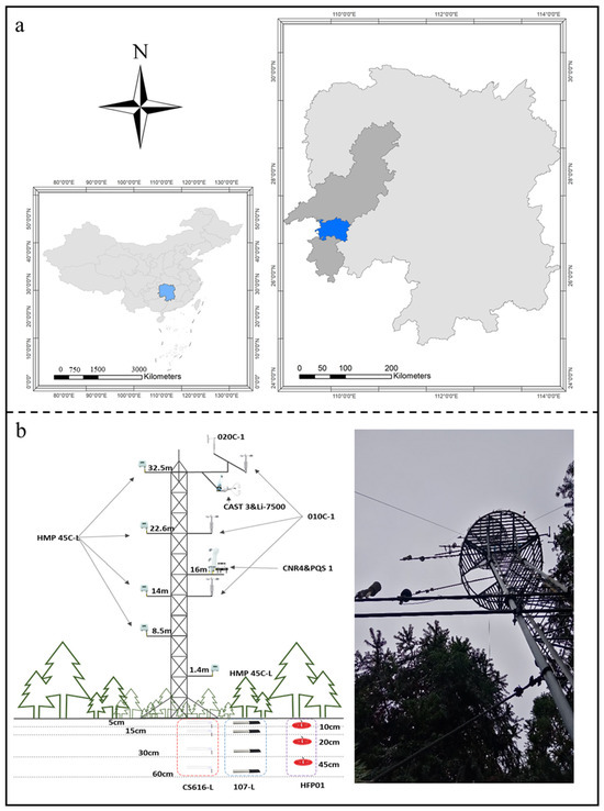 The geographic location of the National Field Scientific Observation and Research Station of Chinese Fir Forest Ecosystem in Huitong, Hunan Province of China: (a) the geography of the study site and (b) the schematic diagram of flux and meteorological gradient observation system.