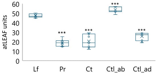 Relative chlorophyll content estimated in pea plants using the portable chlorophyll meter at LEAF CHL PLUS (FT Green LLC, USA): Lf—leaves; Pr—pericarps; Ct—coats; Ctl_ab—abaxial region of cotyledons (periphery); Ctl_ad—adaxial region of cotyledons (inside). Box plots calculated from ten biological replicates. Significant differences compared to leaves are indicated (*** p ≤ 0.001).
