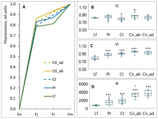 OJIP chlorophyll fluorescence kinetics in leaves (Lf), pericarps (Pr), coats (Ct), abaxial region of cotyledons (Ctl_ab), and adaxial region of cotyledons (Ctl_ad) of pea plants: (A) Chl fluorescence curve. Fo is fluorescence intensity at 50 μs. FJ is fluorescence intensity at 2 ms. Fi is fluorescence intensity at 30 ms. Fm is maximal measured fluorescence intensity. The data were scaled from zero to one. (B) Vj is relative variable fluorescence at the J step. (C) Vi is relative variable fluorescence at the I step. (D) N is. Box plots calculated from 17 biological replicates. Outliers are represented as white dots. Significant differences compared to leaves are indicated (*** p ≤ 0.001, * p ≤ 0.05).