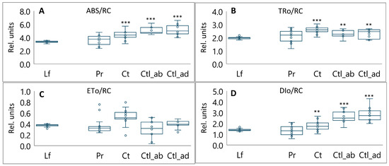 Specific energy fluxes per active reaction center (RC) in leaves (Lf), pericarps (Pr), coats (Ct), abaxial region of cotyledons (Ctl_ab), and adaxial region of cotyledons (Ctl_ad) of pea plants: (A) ABS/RC—absorption flux/effective antenna size (rel.units); (B) TRo/RC—trapped energy flux leading to a reduction in QA (rel.units); (C) ETo/RC—electron transport flux further than QA (rel.units); (D) DIo/RC—dissipation flux (rel.units). Box plots calculated from 17 biological replicates. Outliers are represented as white dots. Significant differences compared to leaves are indicated (*** p ≤ 0.001, ** p ≤ 0.01).