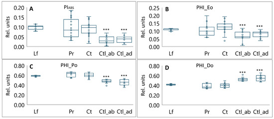 Photosynthetic performance index, yield, and overall flux ratios in leaves (Lf), pericarps (Pr), coats (Ct), abaxial region of cotyledons (Ctl_ab), and adaxial region of cotyledons (Ctl_ad) of pea plants: (A) PIABS—performance index on absorption basis; (B) PHI_Eo—overall electron transport potential of the active PSII RCs; (C) PHI_Po—the maximum quantum yield of primary photochemistry; (D) PHI_Do—the potential energy dissipation flux. Box plots calculated from 17 biological replicates. Outliers are represented as white dots. Significant differences compared to leaves are indicated (*** p ≤ 0.001).