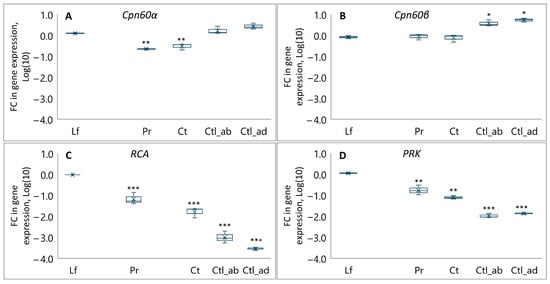 Relative expression of target genes related to RuBisCo structure (A, B) and activity (C, D) in leaves (Lf), pericarps (Pr), coats (Ct), abaxial region of cotyledons (Ctl_ab), and adaxial region of cotyledons (Ctl_ad) of pea plants. (A) RuBisCO large subunit-binding protein subunits alpha (Cpn60α). (B) RuBisCO large subunit-binding protein subunits beta (Cpn60β). (C) RuBisCO activase (RCA). (D) Phosphoribulokinase (PRK). Data were normalized to the expression of the protein phosphatase PP2A regulatory subunit A gene (GenBank Z25888) encoding the phosphoprotein phosphatase 2A. Y-axis corresponds to the difference in a gene relative to the mean expression on a log(10)-scale: values above zero-level represent up-regulation, and below it represent down-regulation. Box plots calculated from three biological replicates. Significant differences compared to leaves are indicated (*** p ≤ 0.001, ** p ≤ 0.01, * p ≤ 0.05).