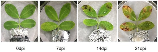 The mutant phenotypes were analyzed using in vitro leaf inoculation. A total of 20 leaves showing good growth were selected and sprayed with an inoculum suspension of 1 × 106 conidia/mL, which was prepared according to Zhang [58]. Two weeks post-inoculation, 20 inoculated leaves from the main stem were collected, and the lesion area on each was scanned. The indoor classification standard for peanut web blotch is as follows: scale 0, no lesion detected; scale 1, 0 < lesion area < 10%; scale 2, 10% ≤ lesion area < 25%; scale 3, 25% ≤ lesion area < 50%; and scale 4, 50% ≤ lesion area [59].