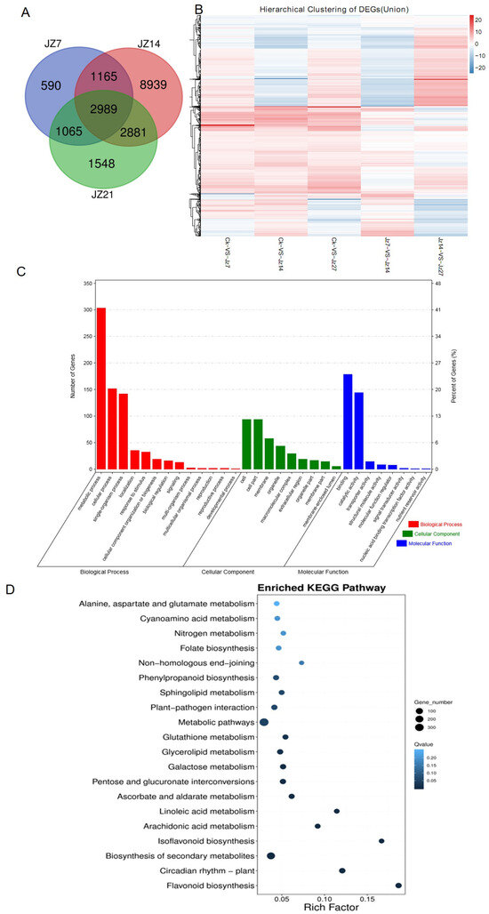 Gene characterization and analysis for differentially expressed genes (DEGs). (A) Venn dialog of expressed genes from genome analysis showing the number of expressed genes in peanut leaves that were infected by P. arachidicola at 7 (JZ7), 14 (JZ14), 21 (JZ21) dpi. The numbers represent the counts of common or uniquely expressed genes. (B) Heatmap of DEGs. Red represents up−regulated genes; blue represents down−regulated genes. Darker colors represent intensity where darker red colors show the most upregulated and the darker blue are the most downregulated genes. (C) Go analysis of gene function classification shows the number of genes involved in biological processes, cell components, and molecular functions, respectively. (D) KEGG pathway enrichments of DEGs. The panel showing 20 enriched KEGG terms for DEGs responding to P. arachidicola infection. The legend is shown on the picture.
