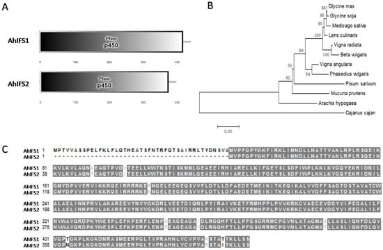 Analysis of IFS protein function. (A) Functional domain schematic for the AhIFS proteins (Arahy.1WY37S and Arahy.B6E5H4). The predicted functional domains (http://smart.embl-heidelberg.de/) indicated that both proteins contained P450 domains. (B) Phylogenetic tree analysis of the AhIFS orthologs. Close orthologs from Arachis hypogaea and other plants, including GmIFS1 (Glycine max, NP_001236022.1), GsIFS1 (Glycine soja, ACA81484.1), MsIFS1 (Medicago sativa, AAF34521.1), LcIFS1 (Lens culinaris, AAF34525.1), VaIFS1 (Vigna angularis, XP_017422719.1), PsIFS1 (Pisum sativum, AAQ10282.2), MpIFS1 (Mucuna pruriens, RDX63227.1), CcIFS1 (Cajanus cajan, AEQ39026.1). (C) AhIFS proteins were used for IFS protein sequence alignment. Amino acid identity of 100% is represented with a black background; >50%, with black text on a gray background; and similar amino acids have white text on a gray background.