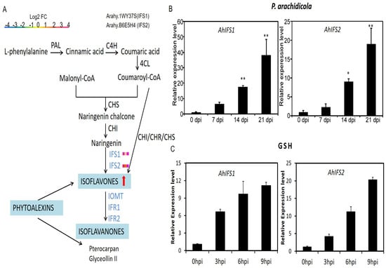 The expression pattern of AhIFS genes. (A) Flavonoid and isoflavone biosynthesis pathways. Enzymes are indicated in uppercase letters. PAL, phenylalanine ammonia-lyase; C4H, cinnamate 4-hydroxylase; 4CL, 4-coumarate: CoA ligase; CHS, chalcone synthase; CHI, chalcone isomerase; IFS, isoflavone synthase; The expression of IFS genes refers to the expression of genes at three infection time points (7, 14, 21 day) in the transcriptome. (B,C) Transcriptional expression of AhIFS genes at the infection stage. The y- and x-axes represent the relative expression levels and time course for P. arachidicola infection, respectively. Mean values and standard deviations (SDs) were obtained from three biological and three technical replicates. Error bars are SDs; time points are 0, 7, 14, and 21 hpi; * and ** indicate that the expression level was significantly and extremely significant different from the control.