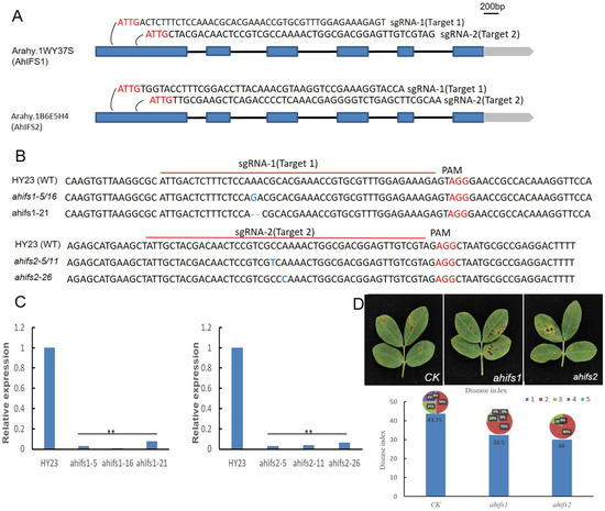 To further understand the function of AhIFSs, we designed sgRNAs to edit the two homologous AhIFS genes using CRISPR/Cas9 technology. Two independent CRISPR/Cas9 vectors, pCAMBIA1300-cas9-AhIFS1 and pCAMBIA1300-cas9-AhIFS2, were created and individually introduced into the ‘huayu23’ (HY23) peanut cultivar by pollen tube injection instead of going through rooting and acclimatization. These plants were then allowed to grow and produce putative transgenic plants for this experiment. A total of 68 and 73 independent positive transgenic lines were obtained from the ∆ahifs1 and ∆ahifs2 transformant events, respectively. Leaves of the knockout mutant plants were spray-inoculated with conidial suspensions of P. arachidicola and their phenotypes were observed. Necrosis symptoms were visually observed at 14 days post-inoculation (dpi), and Figure 6D shows that the lesion diameters and disease index of the mutant peanut leaves were significantly larger than those of the controls.