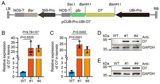 Identification of O7 overexpression lines. (A) Schematic diagram of pCUB-Pro: UBI-O7-gfp. (B,C) Quantification of relative O7 expression in leaves (B) and kernels (C) of O7 overexpression lines (#1, #4). (D,E) Protein levels assessment in leaves (D) and kernels (E) of O7 overexpression lines (#1, #4). GAPDH antibody used as the loading control. Error bars indicate ± SD from three biological repeated samples. Statistical significance was determined using A two-tailed Student’s t-test.
