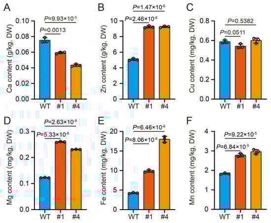 Oxalate has a strong affinity for metal ions. The overexpression of oxalate decarboxylase from Flammulina velutipes has been shown to significantly reduce oxalate levels and increase micronutrients content in soybean and grass pea seeds [32]. Consequently, we explored whether the overexpression of O7 can elevate micronutrient levels in maize kernels. We performed a content analysis of calcium, zinc, copper, magnesium, iron, and manganese using ICP-OES. The results revealed a significant increase in zinc, magnesium, iron, and manganese levels compared to the WT, although calcium and copper levels showed no significant change (Table S2; Figure 4). These findings indicate that reducing oxalate content in kernels can enhance the accumulation of micronutrients.