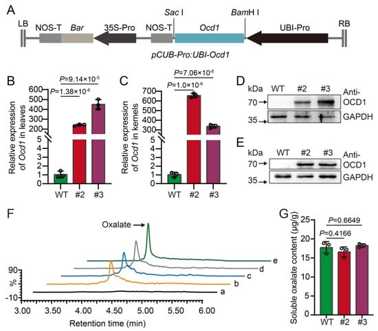 The oxalyl-CoA synthetase, encoded by the O7 gene, initiates the pathway responsible for oxalate acetylation degradation by catalyzing the conversion of oxalate into oxalyl-CoA [30]. A loss of function in this enzyme results in the excessive accumulation of oxalate in seeds. To determine whether overexpressing O7 can decrease oxalate levels in maize kernels, the O7 overexpression vector was used to transform the inbred line KN5585 [31] (Figure 2A). A total of 10 independent transgenic events were obtained. Subsequently, RT-qPCR and Western Blot analyses were conducted to detect transgenic events, and two independent T2 overexpressed lines (named #1 and #4) were identified (Figure S2 and Figure 2B–E).