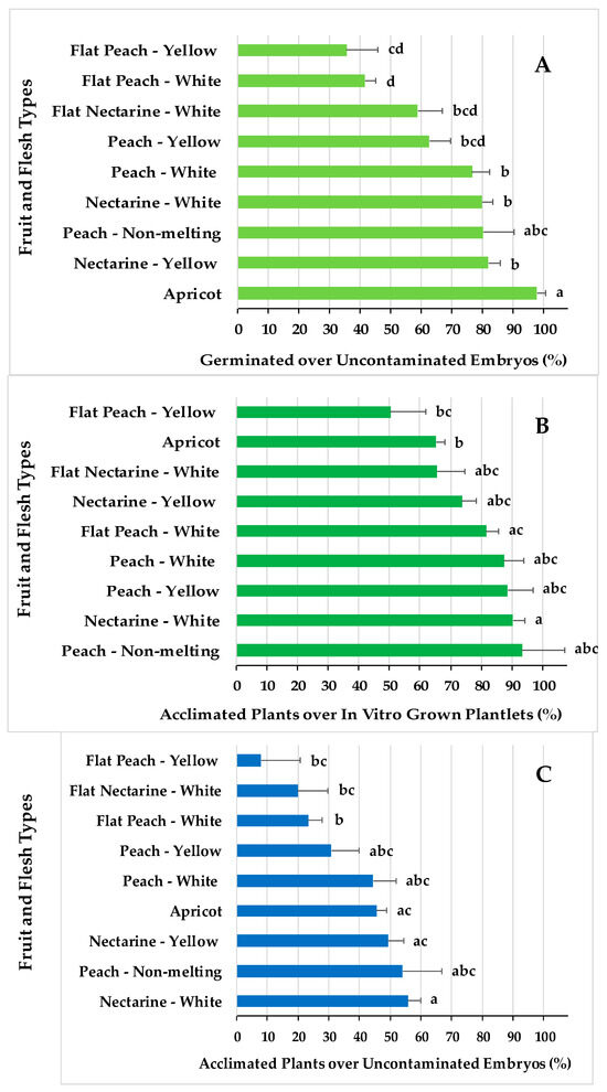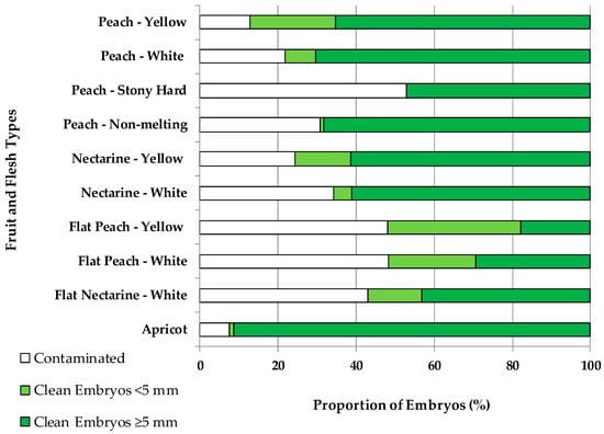 - Mansvelt, E.L.; Pieterse, W.-M.; Shange, S.B.D.; Mabiya, T.C.; Cronjé, C.; Balla, I.; Ham, H.; Rubio-Cabetas, M.-J. Embryo Rescue of Prunus Persica: Medium Composition Has Little Influence on Germination. Acta Hort. 2015, 1084, 207–210. [Google Scholar] [CrossRef]