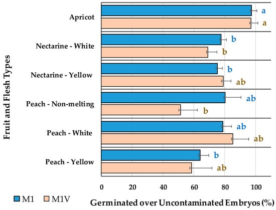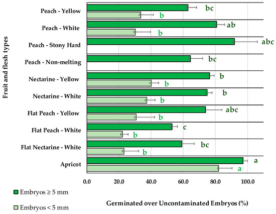 3.2. Embryo Germination Percentages Depending on the Fruit Type and Embryo Size